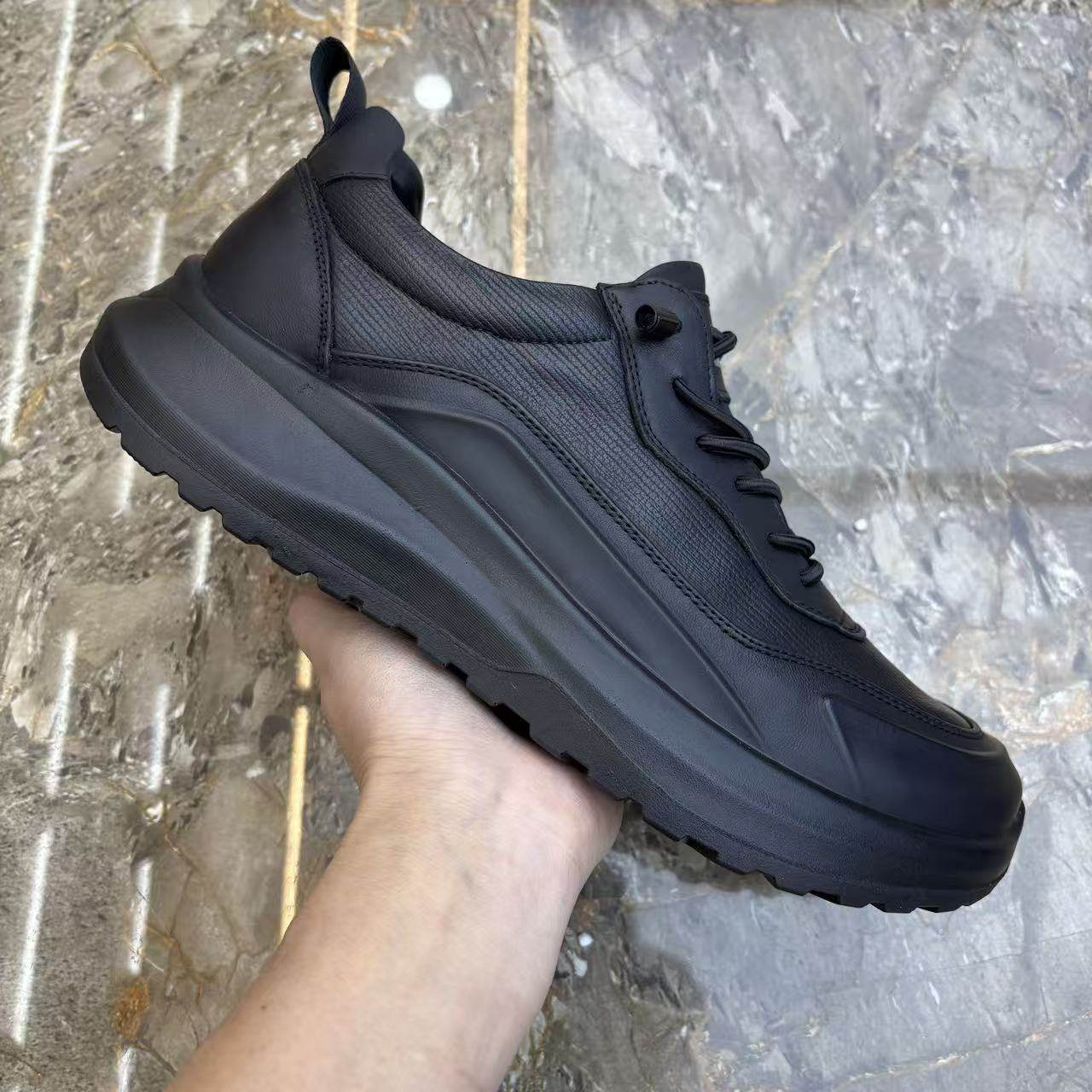 广州高品质真皮男鞋百搭全黑色橡胶软底休闲鞋弹力带套脚运动鞋子