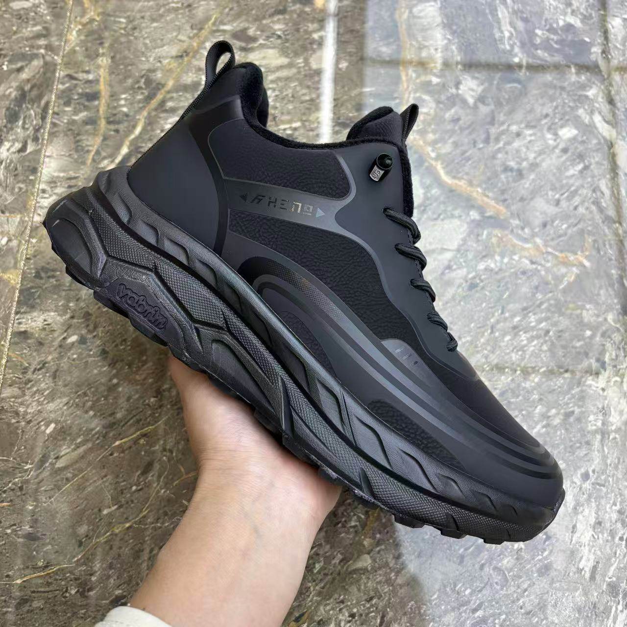 冬季黑色皮面男鞋中高帮厚底加绒保暖休闲棉鞋弹力鞋带套脚运动鞋