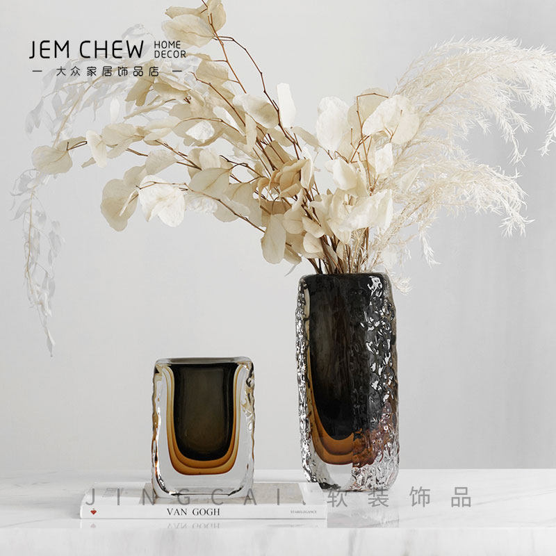 轻奢简约创意黑色渐变加厚琉璃方形高级氛围感插花艺套装客厅餐桌