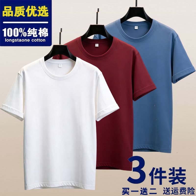 【买一送二】210g男士短袖t恤纯棉纯色宽松全棉半袖圆领汗衫简约