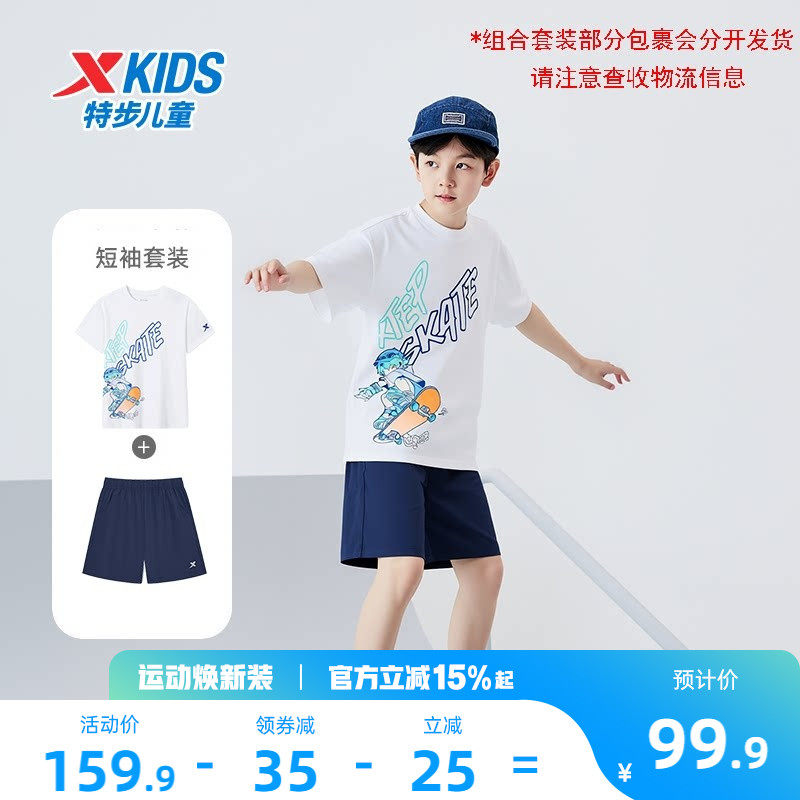 特步儿童男童套装2026夏季新款滑板印花短袖短裤中大童夏装两件套