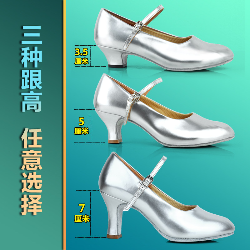 中跟银色舞蹈鞋软底演出鞋四季广场舞鞋真皮女成人软底广场舞跳舞
