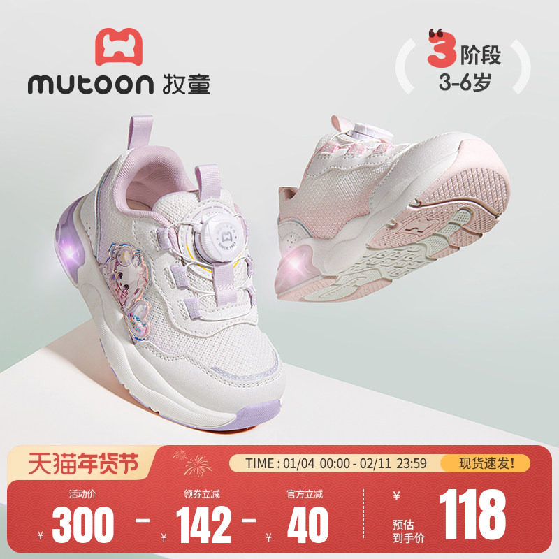 牧童女童鞋春夏儿童轻便减震旋转纽扣运动鞋透气网面甜美女闪灯鞋