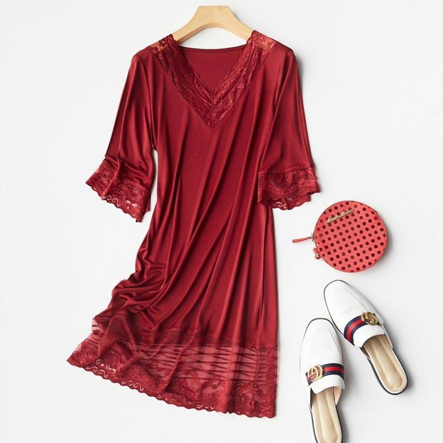 新款蕾丝边V领中袖真丝连衣裙可外穿家居服宽松打底裙睡裙中裙潮