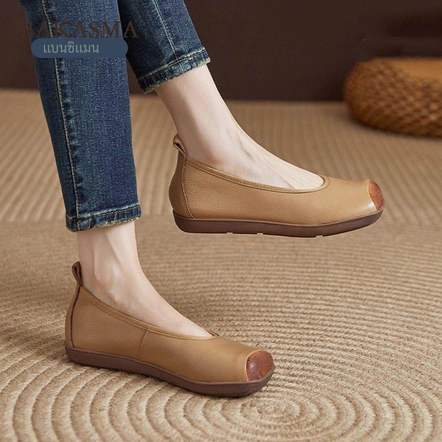 BAKASMA覆古单鞋女士平底舒适方头奶奶鞋一脚蹬休闲中年浅口女鞋