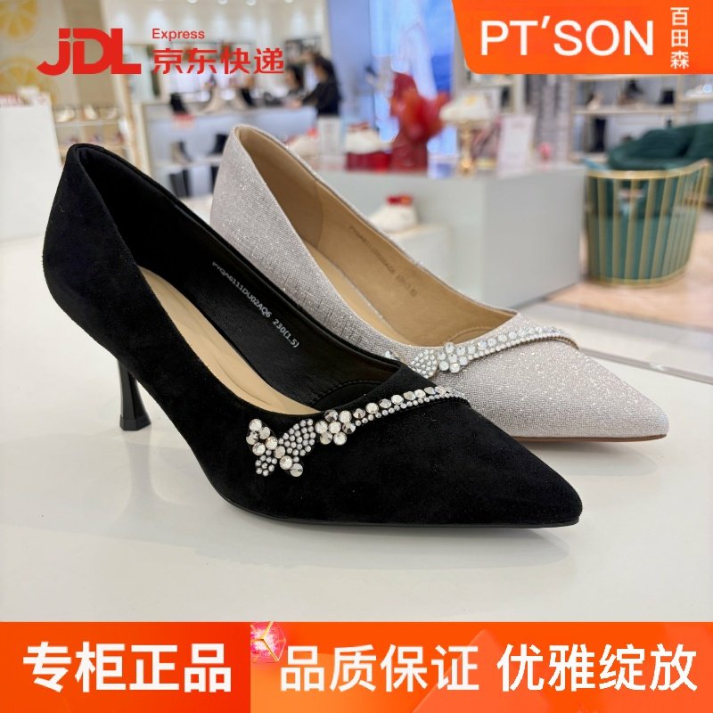 百田森女鞋水钻尖头浅口单鞋细高跟宴会婚鞋2026春季新款PYQA6111