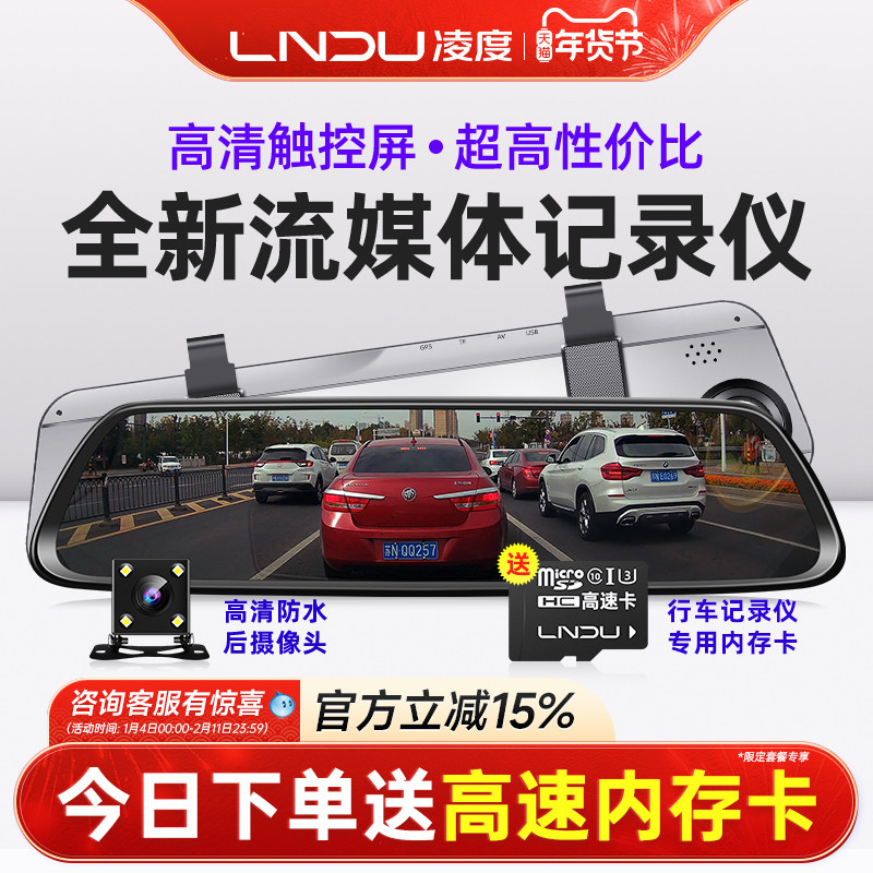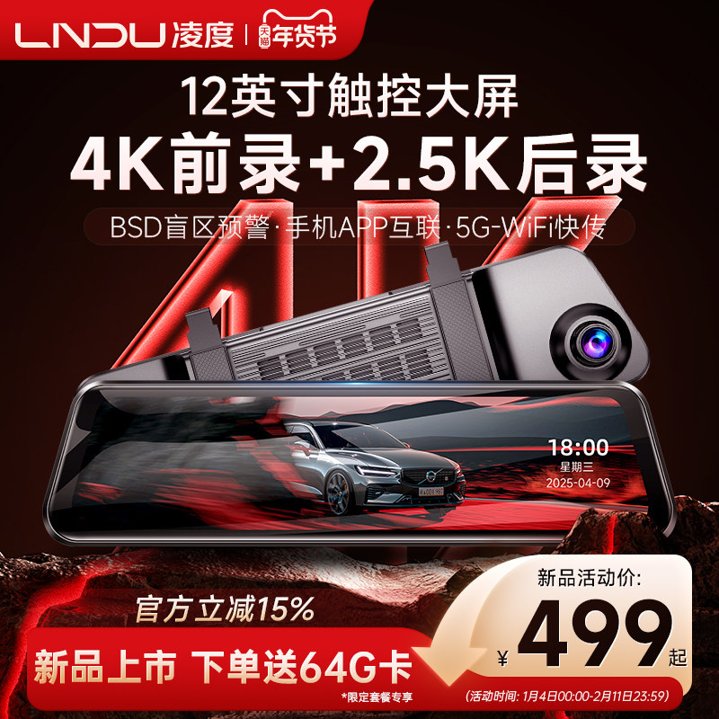 凌度12寸全屏行车记录仪超高清夜视流媒体后视镜倒车影像2025新款