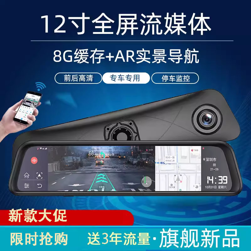 新款12寸全屏行车记录仪前后双录高清流媒体后视镜导航倒车一体机