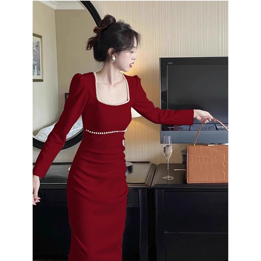 2026新款订婚回门服新娘平时可穿敬酒服生日礼服红色方领连衣裙女