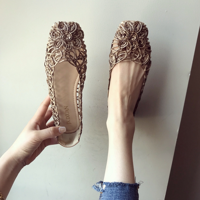 外贸原单女鞋微瑕新款时尚百搭方头纯色平底网面镂空单鞋包头凉鞋
