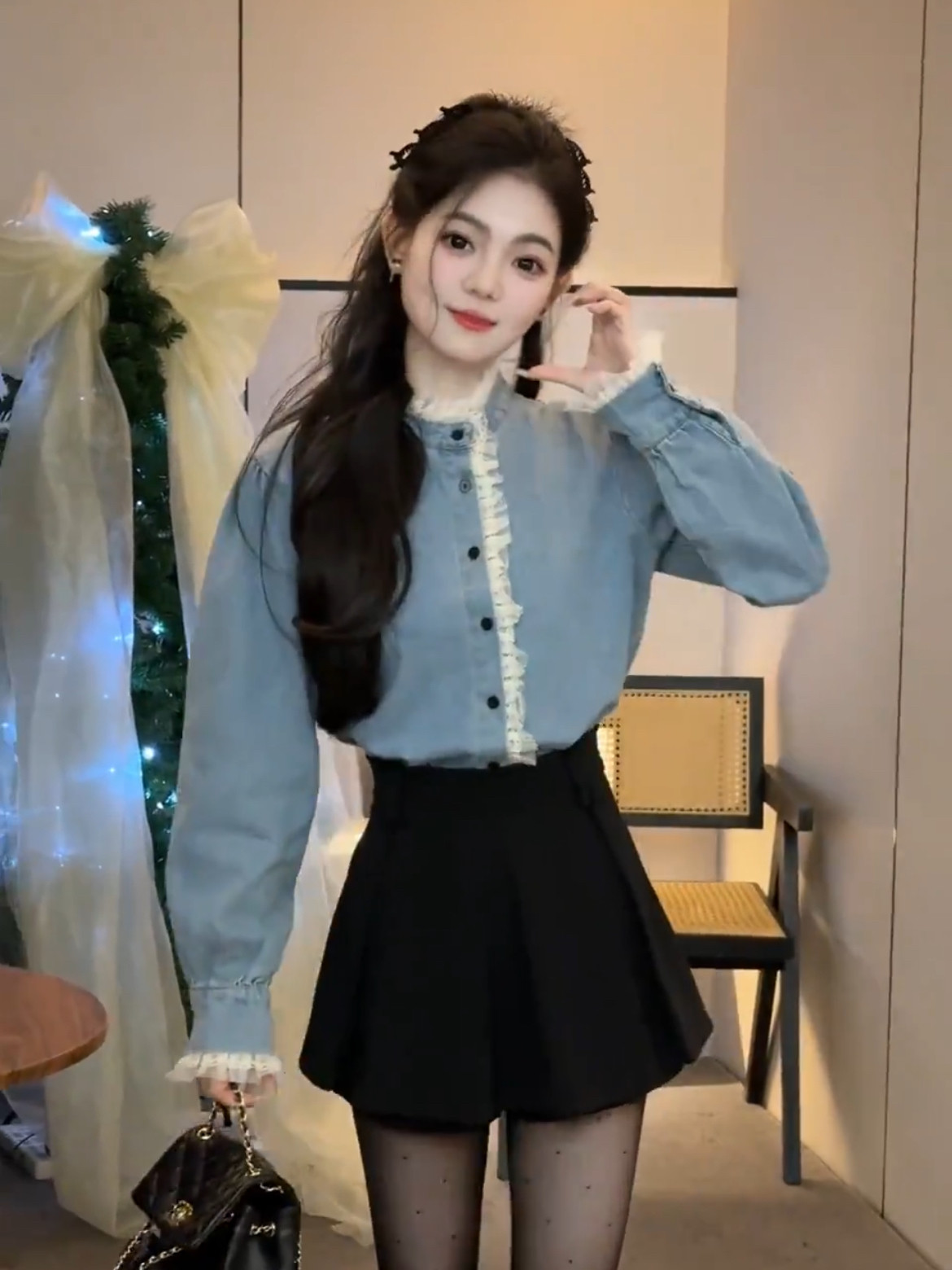欧洲站2026春秋新款时尚套装女蕾丝花边拼接牛仔衬衫+半身裙