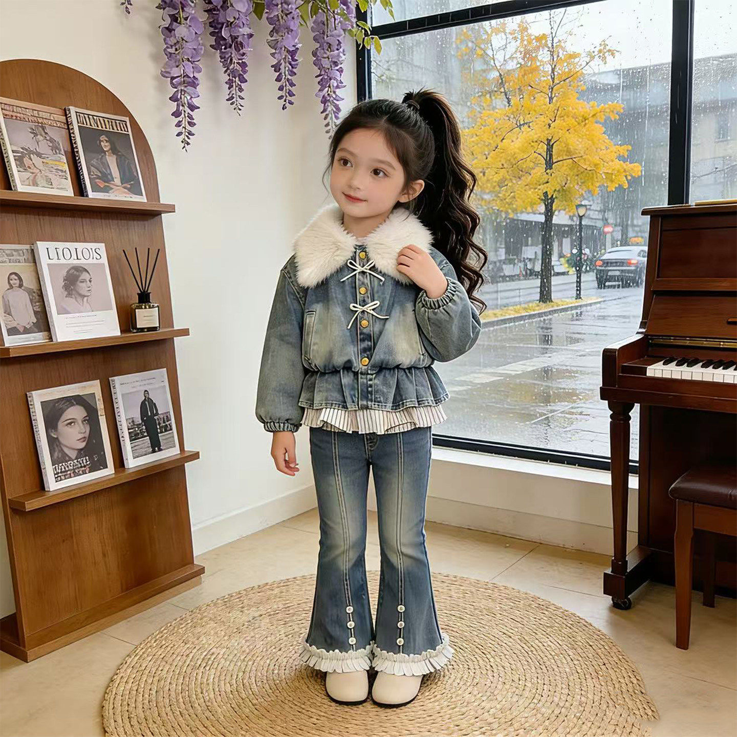 欧洲站女童冬加厚牛仔套装2025冬季假两件毛领上衣修身喇叭裤两件