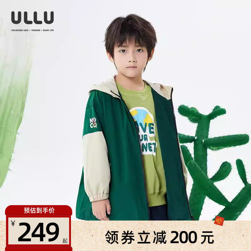 ULLU优露童装男童中长风衣25春款字母胶印三色拼接连帽风衣外套