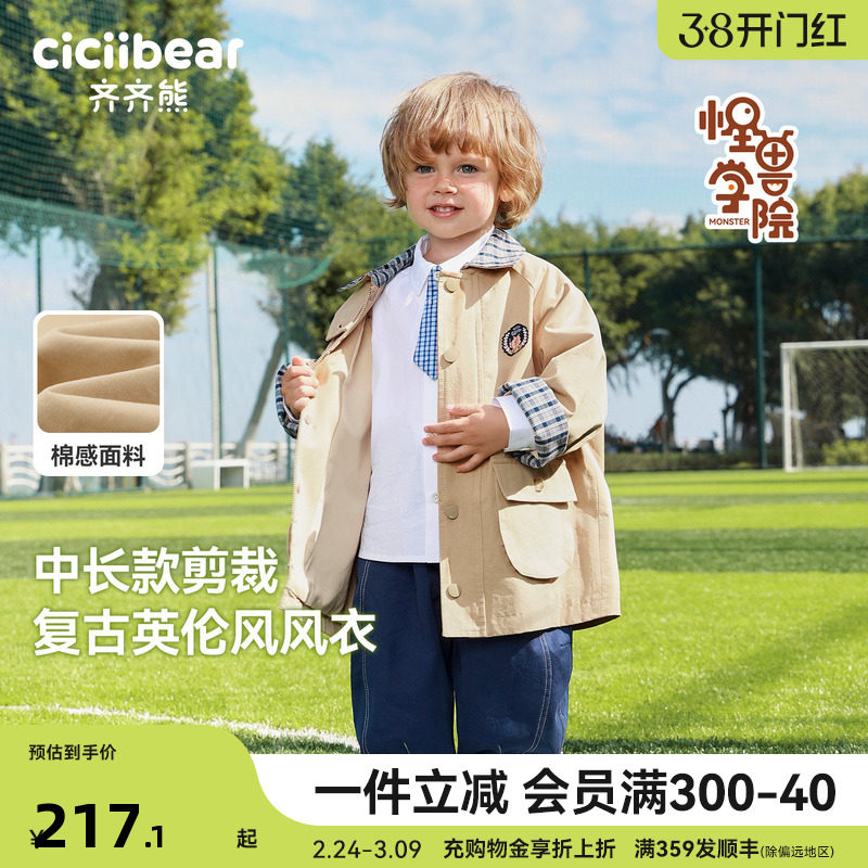 [学院风]齐齐熊宝宝中长款风衣外套男童春款2026新款儿童防风保暖