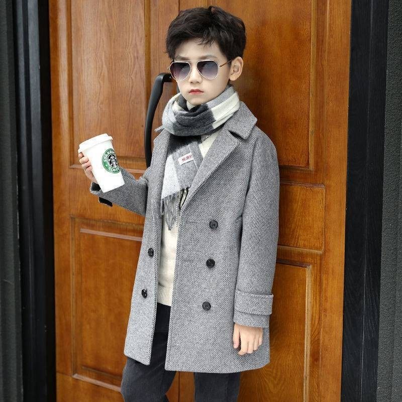 男童中长款毛呢大衣儿童呢子风衣秋冬灰色夹棉衣服男孩子酷帅外套