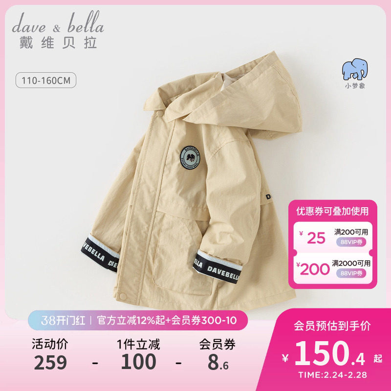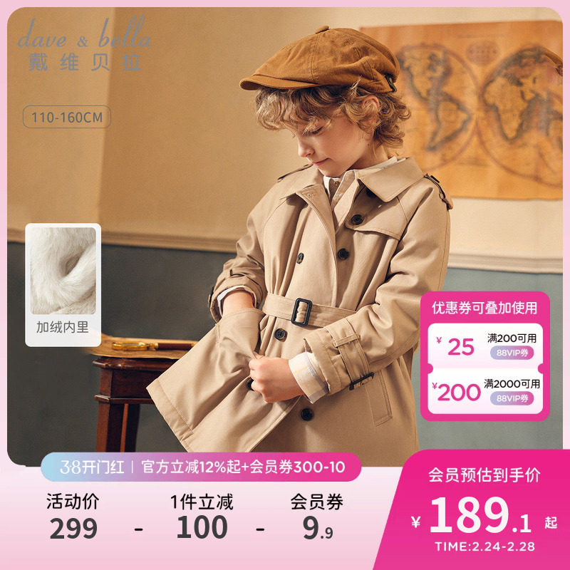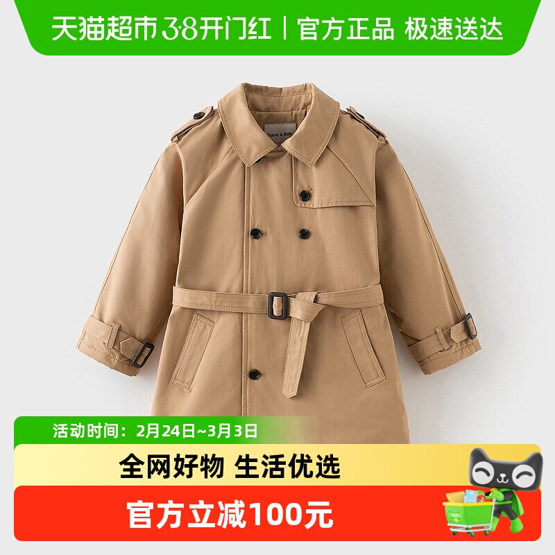 戴维贝拉男童中长款风衣2026冬新款儿童英伦风外套女大童加绒上衣