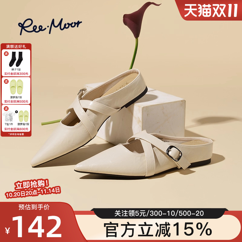 reemoor2025新款法式尖头坡跟单鞋女交叉带扣真皮浅口半拖鞋睿慕