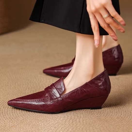 坡跟单鞋女皮鞋2025新款通勤高跟鞋真皮浅口尖头磨砂皮内增高女鞋