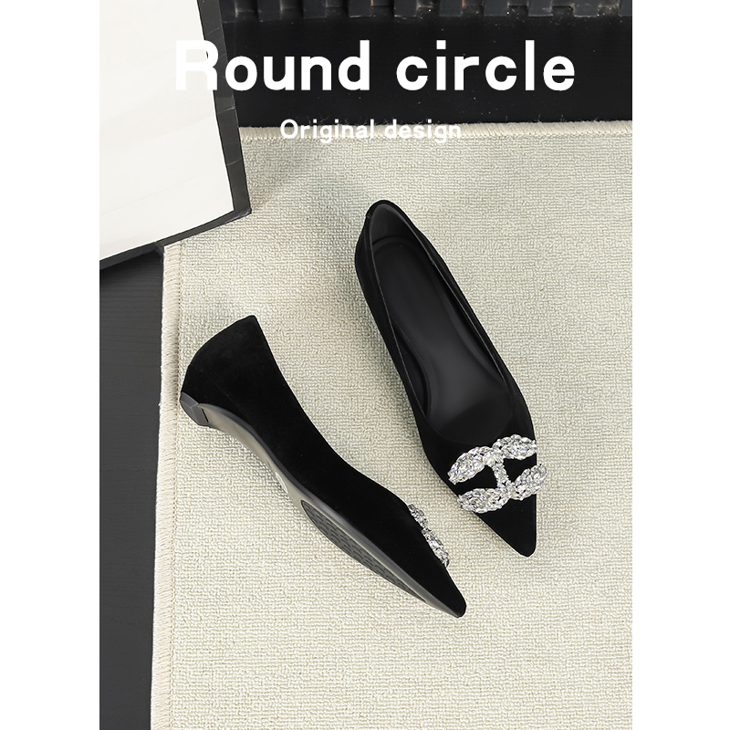 2025新款法式名媛范水钻方扣尖头浅口平底单鞋仙女坡跟伴娘鞋舒服