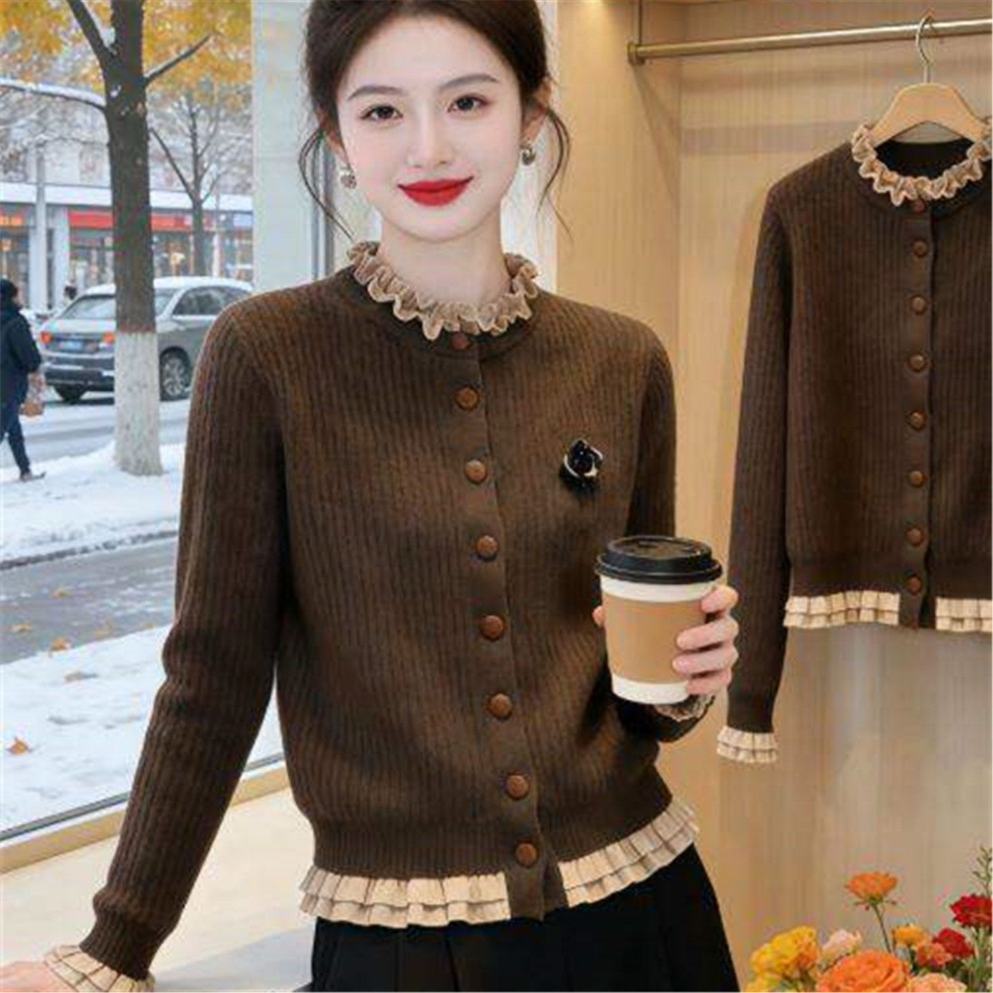 2026春装新款时尚百搭针织衫外套女显瘦上衣木耳领开衫短款小衫潮