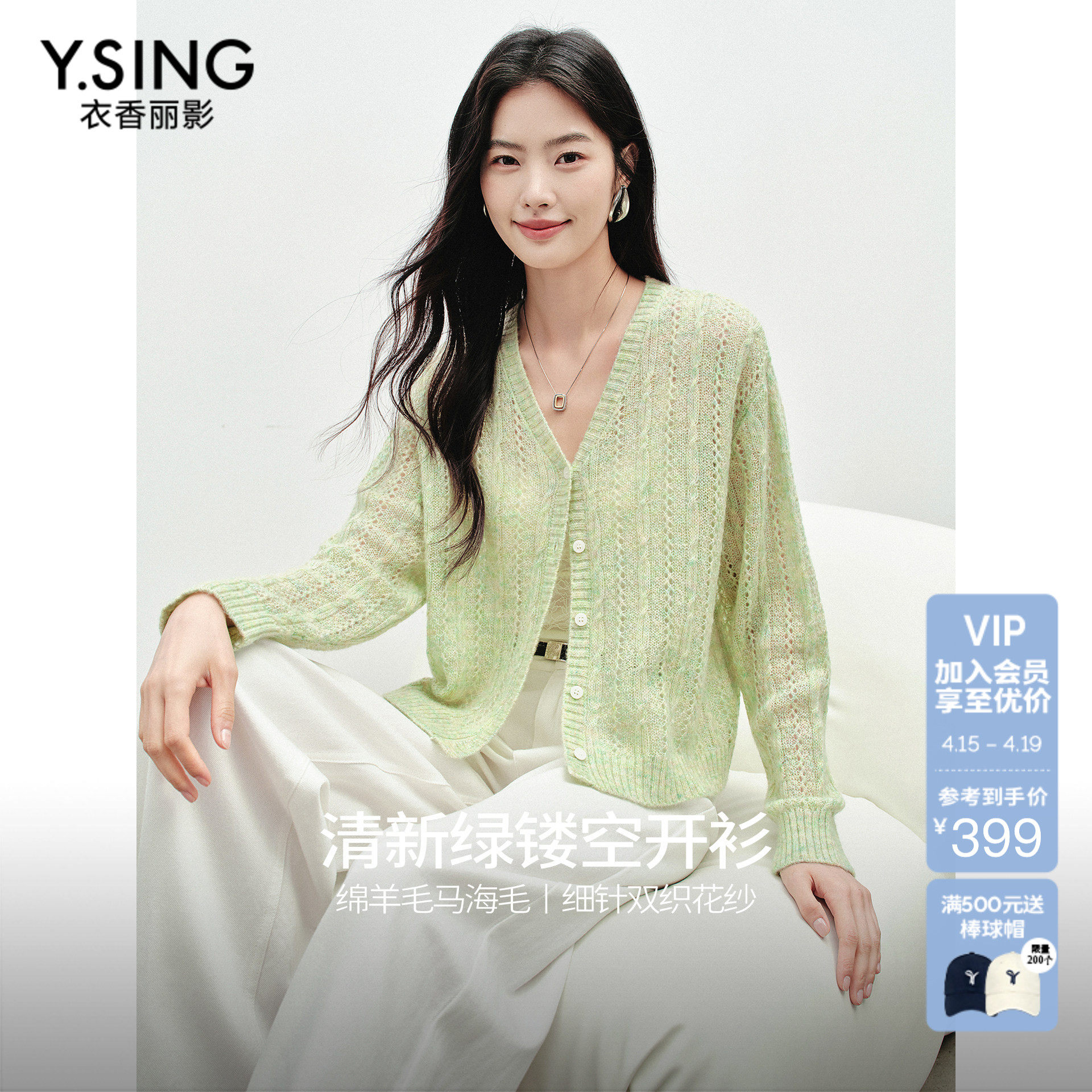 衣香丽影绿色镂空针织开衫女短款2026春装新款马海毛羊毛花纱上衣