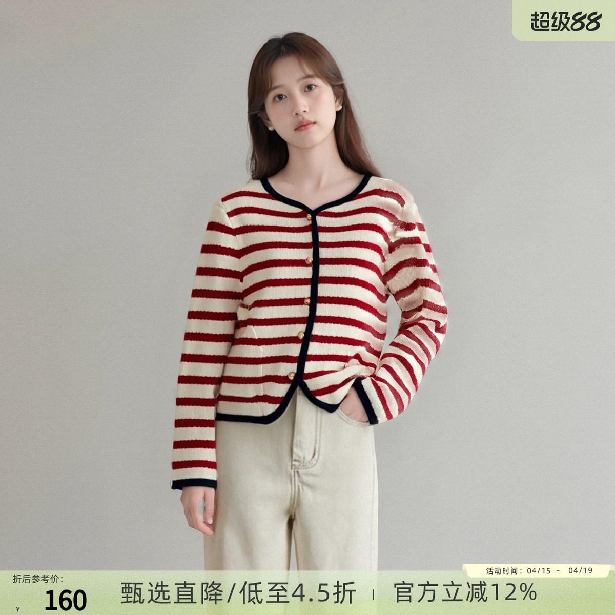 西町村屋学院风针织衫女春装新款复古慵懒条纹短款开衫AA9213010