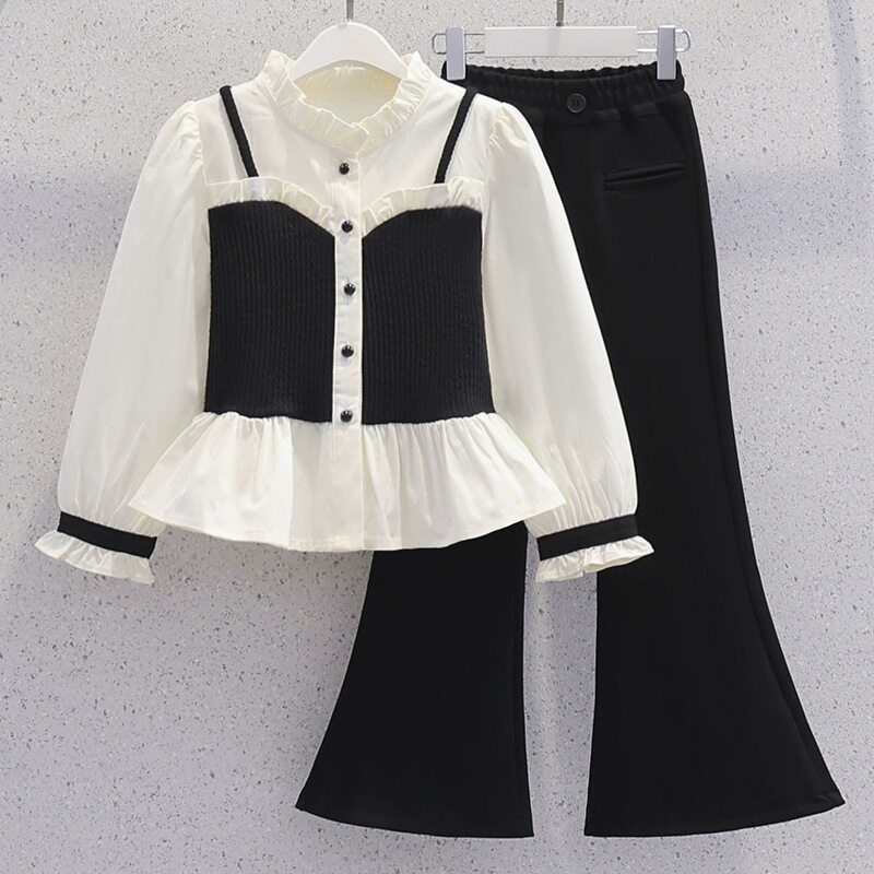 女大童洋气时髦套装春装气质女孩千金小香风儿童衬衫喇叭裤两件套