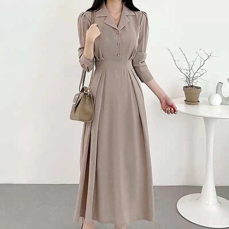2025韩国chic春装新款轻熟收腰Polo领连衣裙泡泡袖显瘦衬衫a字裙