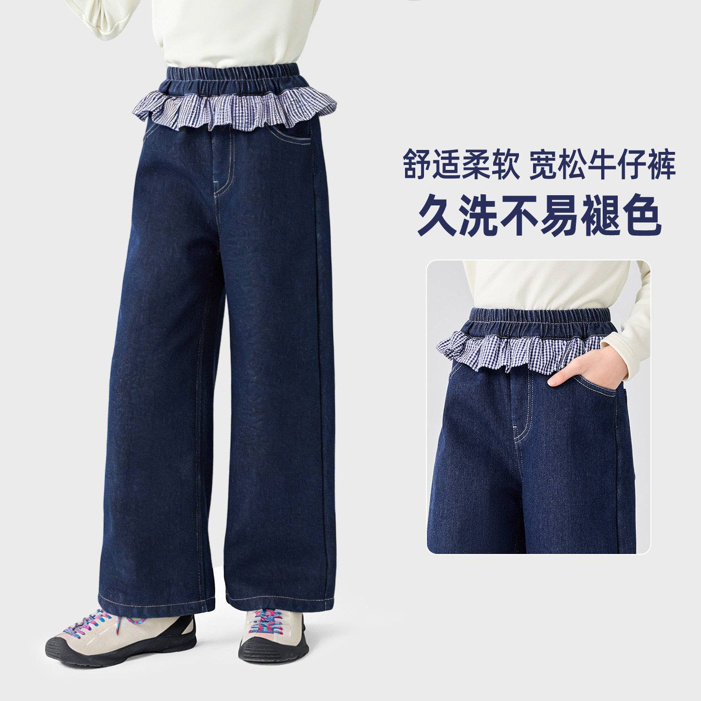 儿童裤子女童牛仔阔腿裤2026新款春装中大童格子花边休闲长裤童装