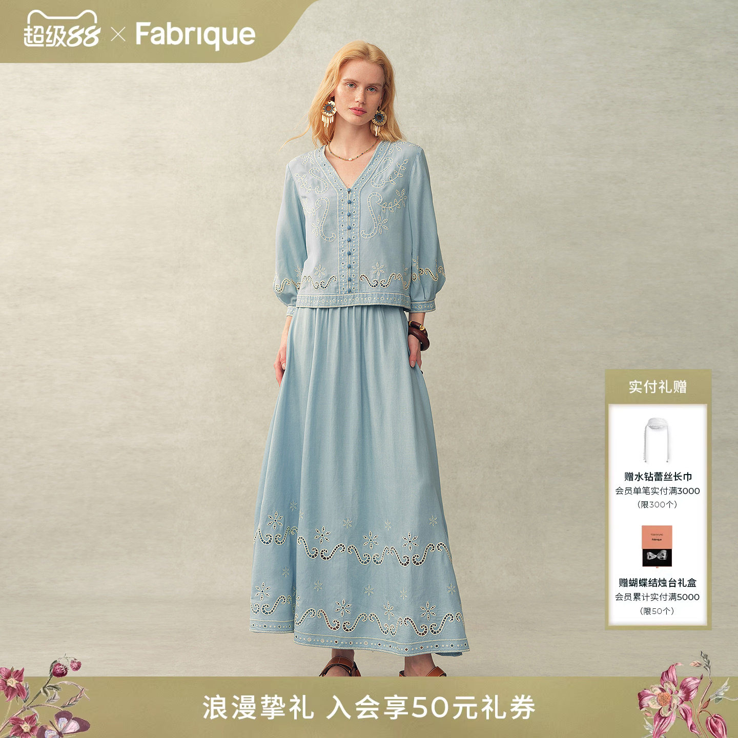 Fabrique 水洗冰蓝绣花V领牛仔衬衫上衣半裙套装女2026年夏季新品