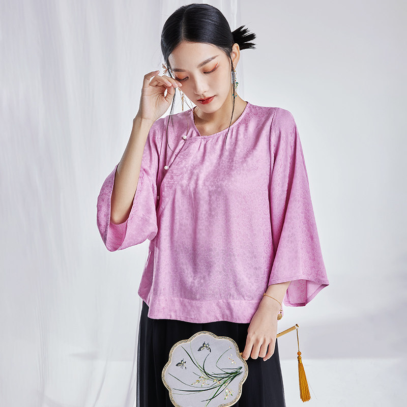 真丝提花喷绘香云纱莨绸中式改良文艺复古圆领斜襟唐装女短袖上衣
