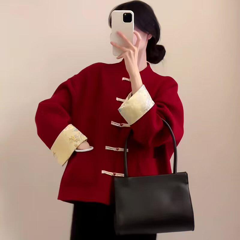 新年战袍红色唐装女新中式女装拜年服过年高级感穿搭国风毛呢外套
