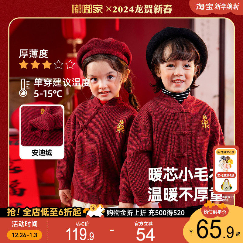 嘟嘟家儿童毛衣红色宝宝冬季拜年服男童针织唐装女童冬装上衣年装
