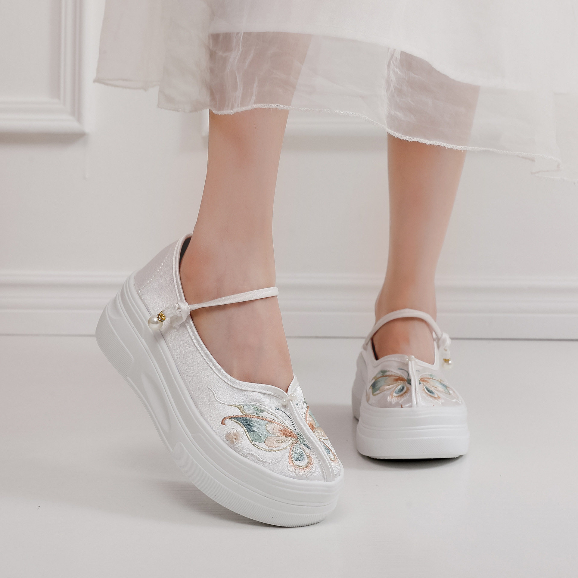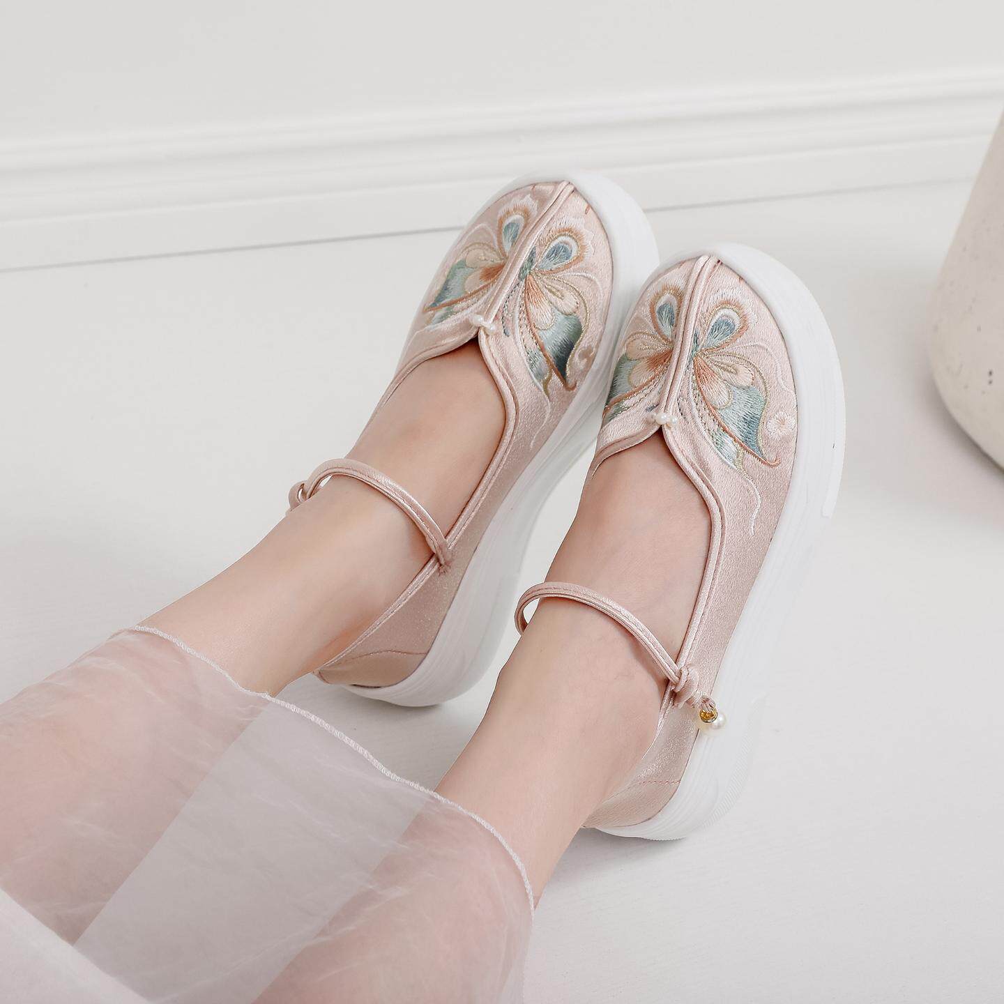 蝴蝶松糕底新中式轻便厚底增高民族风布鞋绣花鞋汉服马面裙旗袍鞋