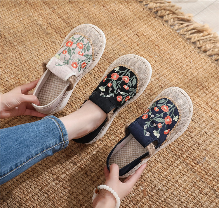 2024新款青年绣花民族风布鞋浅口圆头花卉套脚平底休闲女士帆布鞋