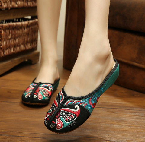 蝴蝶刺绣民族风布鞋女夏外穿古风绣花拖鞋一脚蹬手工编织浅色鞋夏