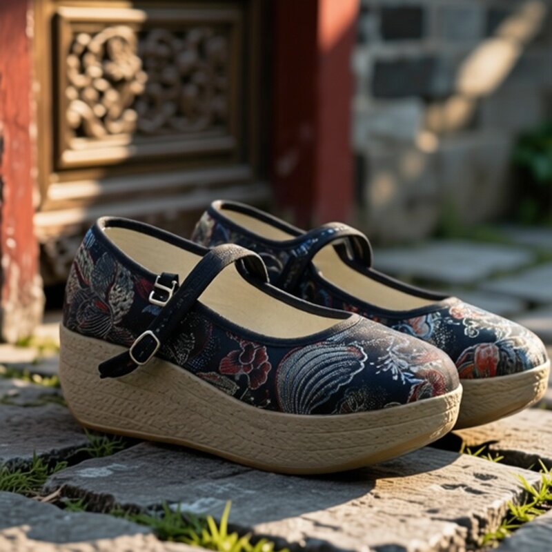 月蝶 2026新款新中式轻便厚底民族风布鞋女绑带民族风绣花鞋