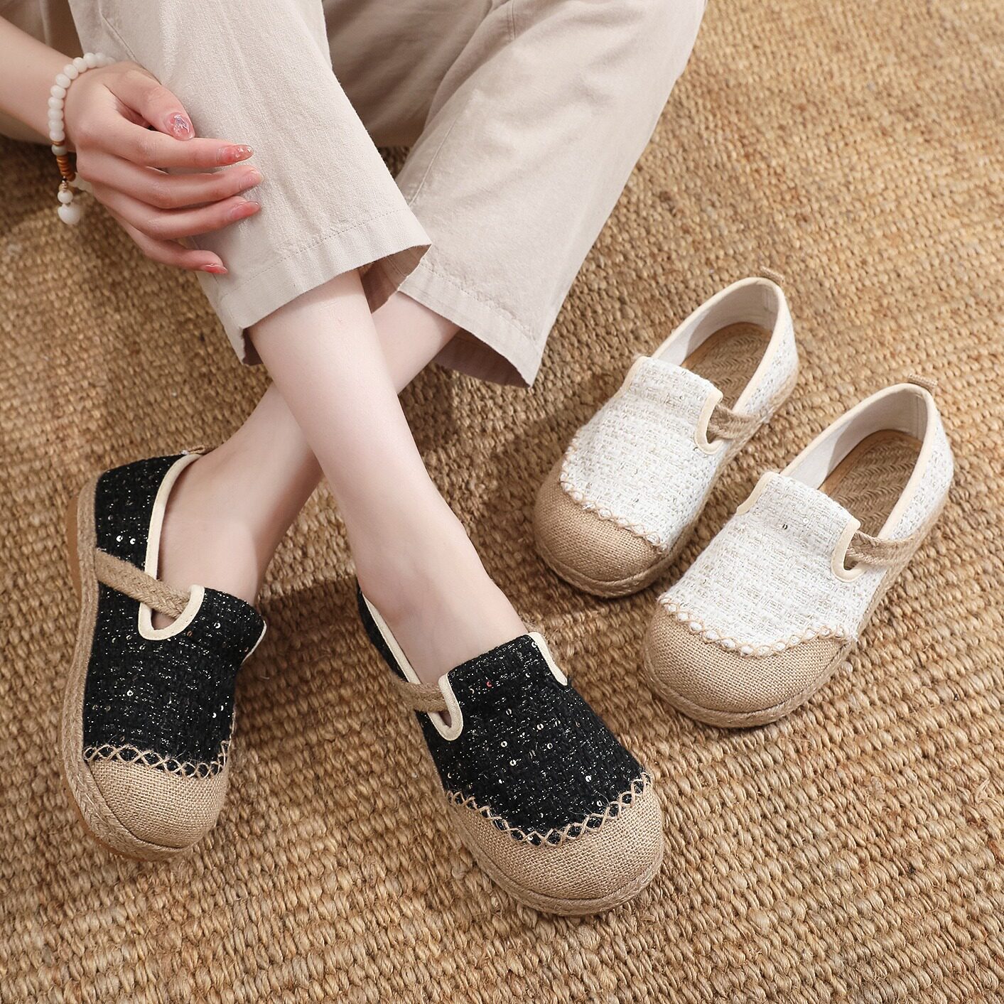 老北京原创民族风布鞋女2025夏季新款亚麻飞织网面透气草编渔夫鞋
