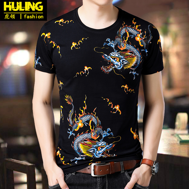 中国风神龙款男士短袖t恤修身潮流青年社会体恤纯棉圆领夏装上衣