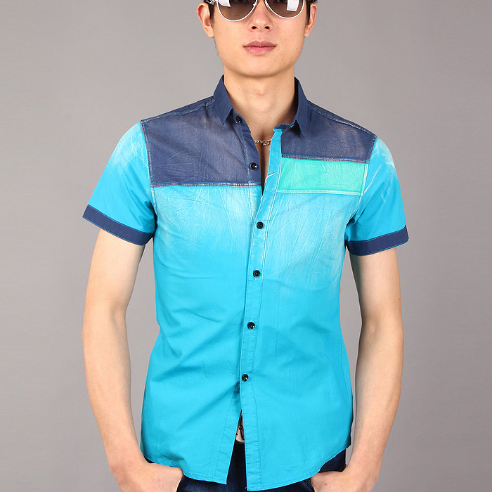 夏装新款男士短袖衬衫男款韩版修身牛仔衬衣亮色寸衫拼接休闲衬衫