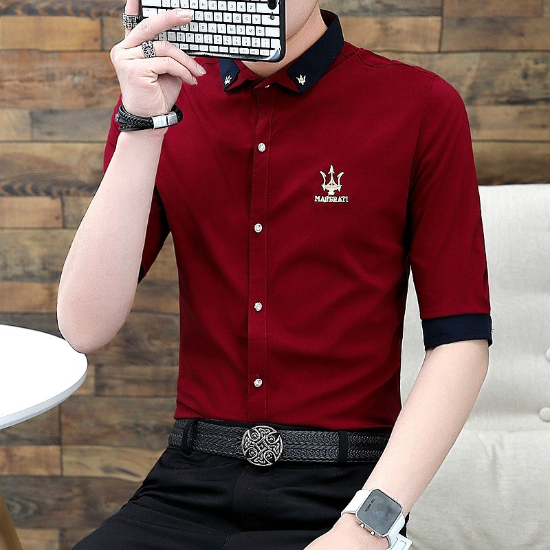 男士夏装短袖衬衫韩版潮流修身五分袖衬衫发型师薄款七分袖休闲寸