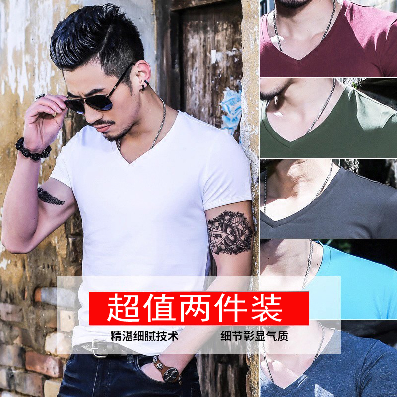 夏装男士短袖T恤纯棉v鸡心领潮流百搭上衣服半袖男装休闲修身体恤