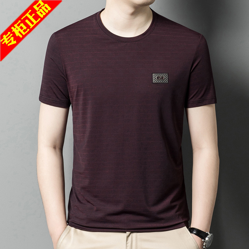 冰丝短袖t恤男无领酒红修身垂感弹力薄款速干中年爸爸夏装上衣服