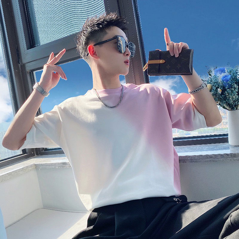 夏季网红渐变色男短袖潮牌痞帅T恤2023新款潮流修身夏装半袖体恤