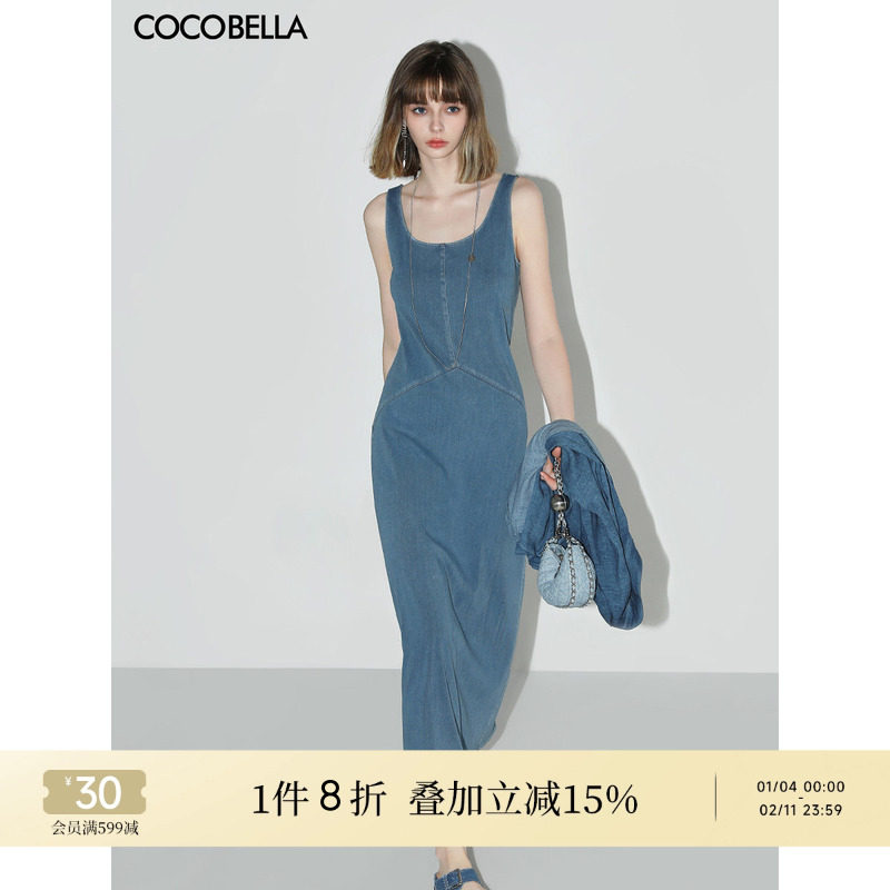 COCOBELLA简约弹力针织无袖牛仔连衣裙设计感休闲背心长裙FR615