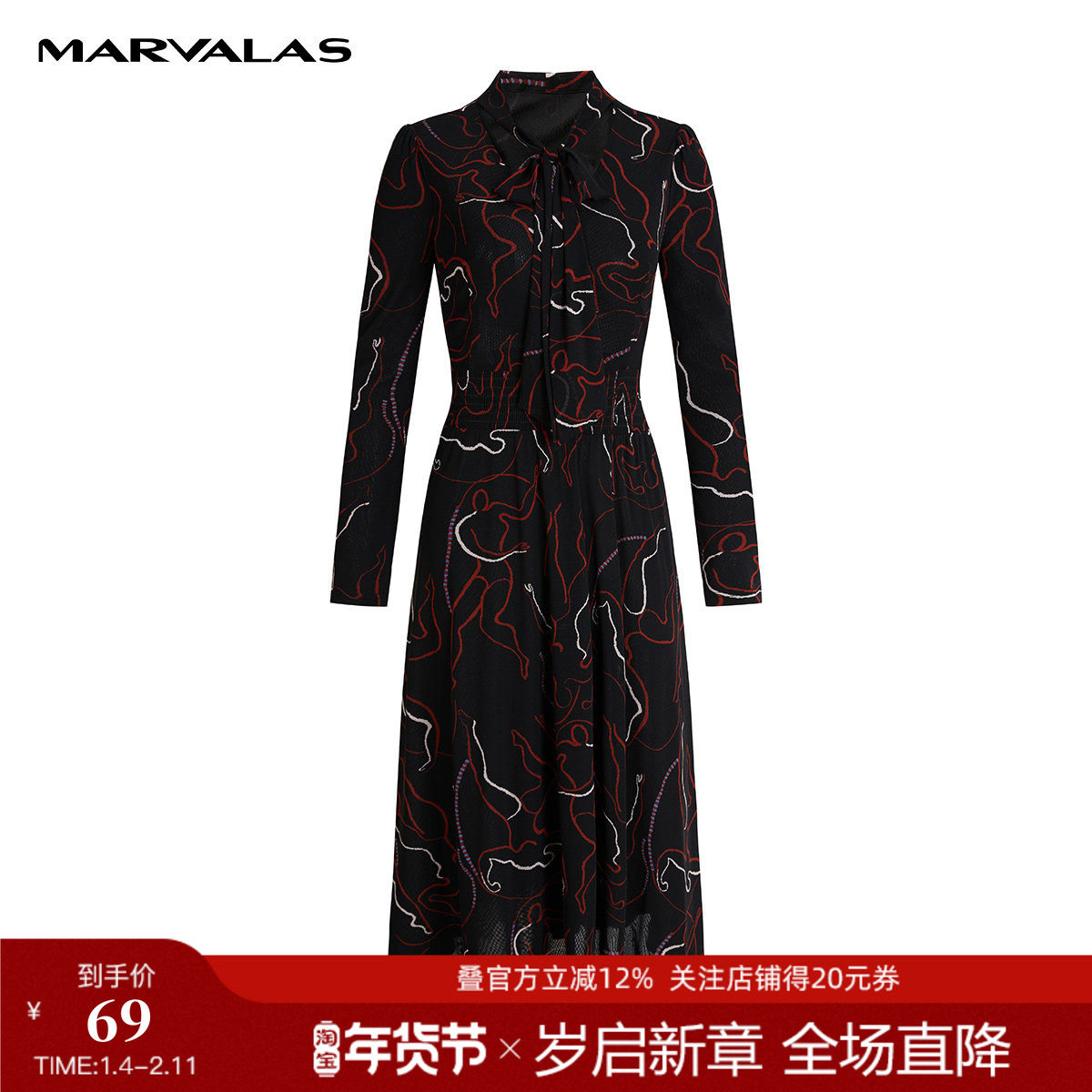 曼德诗黑花中长连衣裙女2024秋季新品印花松紧裙长袖薄款弹力长裙