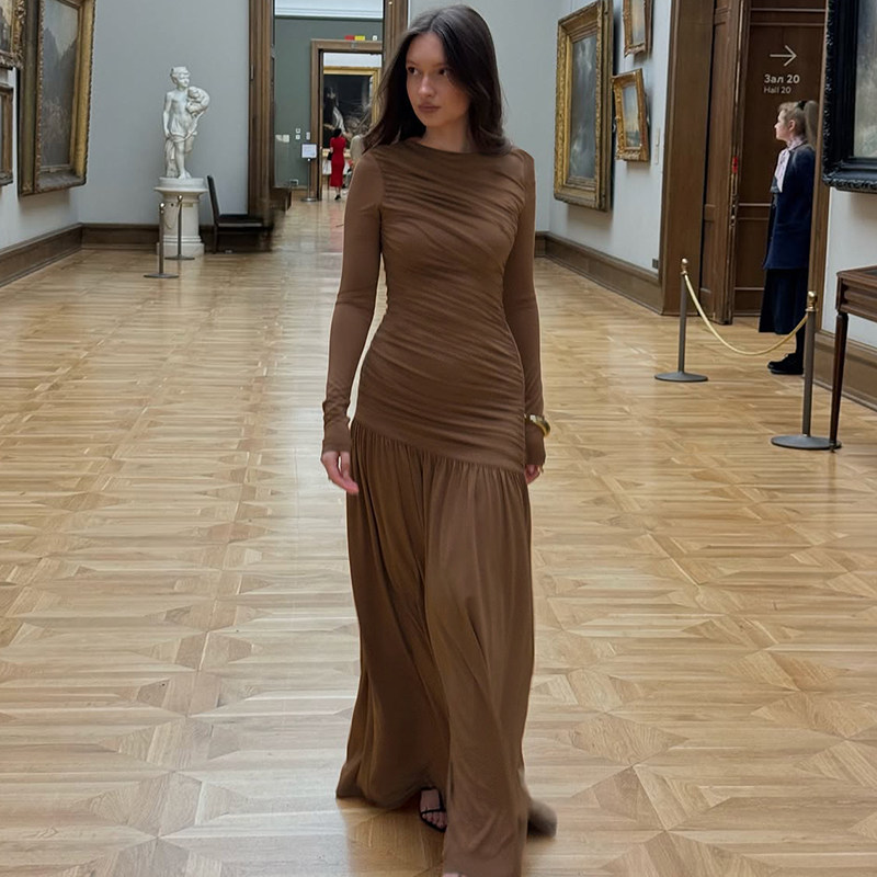 shemoda秋季圆领长袖连衣裙女弹力修身显瘦褶皱高腰拼接坠感长裙