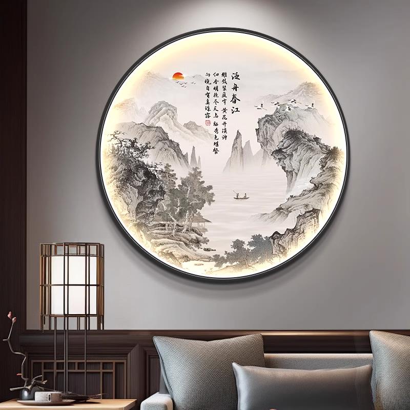 带灯玄关装饰画圆形山禅意画入户正对门挂画客厅背景墙壁书房灯画