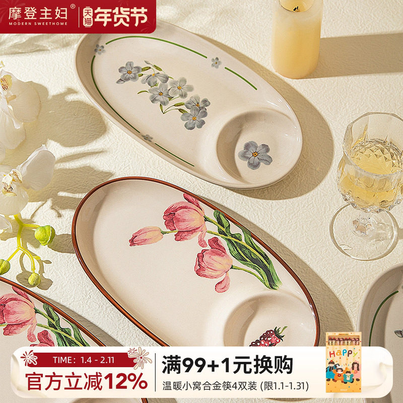 摩登主妇小苍兰饺子盘带醋碟分格餐盘家用餐具鱼盘吃饺子专用盘子