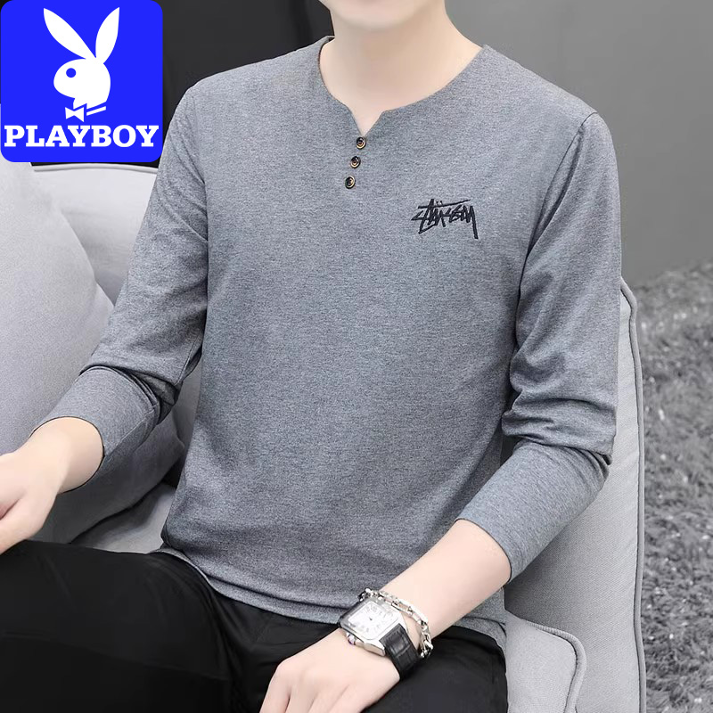 花花公子秋季长袖t恤男士V领秋衣潮流潮牌上衣服打底衫卫衣体恤男